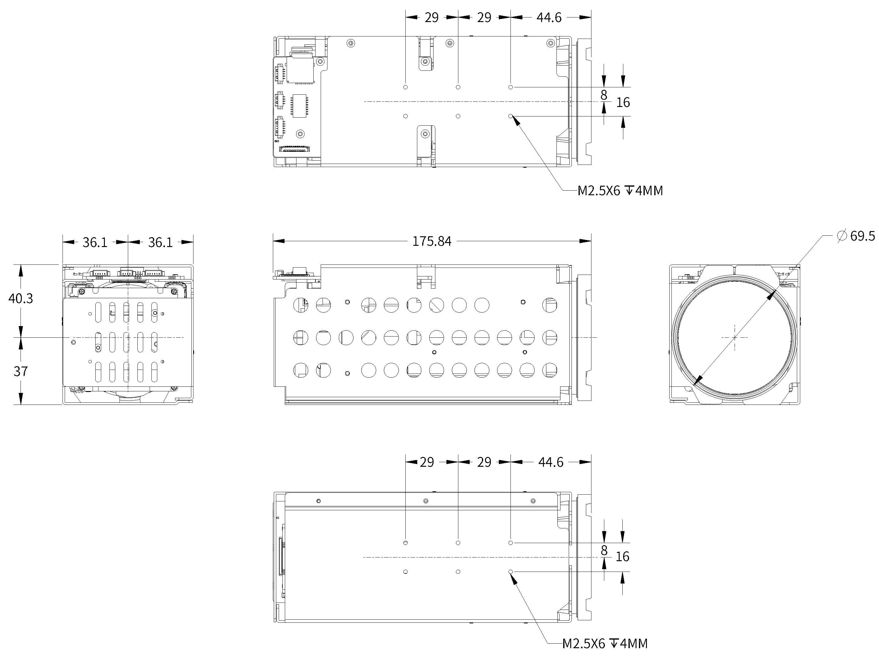 Porta Ethernet de 4pin, 6pin Power & Uart Port, 5pin Audio Port. 30 pin mipi |